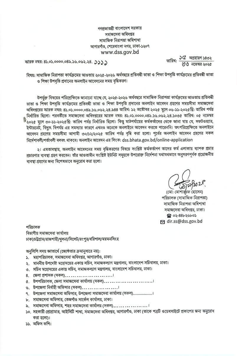 প্রতিবন্ধী ভাতা ও প্রতিবন্ধী শিক্ষা উপবৃত্তির আবেদনের সময় পুনরায় বৃদ্ধি ৩০/১২/২০২৫ পর্যন্ত